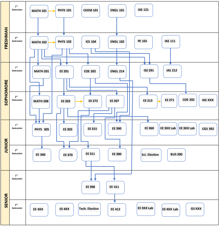Course Credits Course Name EE 201 (3-0-3) Electric Circuits I COE 202 (3-0-3) Digital Logic Design EE 203 (3-0-3) Electronics I EE 207 (3-0-3) Signals & Systems EE 213 (2-0-2) Electric Circuits II EE 271 (0-3-1) Electric Circuits II lab EE 272 (0-3-1) Analog and Digital Electronics Lab EE 303 (3-0-3) Electronics II EE 311 (3-0-3) Fundamentals of EE Design EE 315 (3-0-3) Prob. Methods for EE EE 340 (3-0-3) Electromagnetic Waves and Applications EE 360 (3-0-3) Elec. Energy Eng. EE 370 (3-0-3) Communications Engineering EE 380 (3-0-3) Control Eng. EE 390 (3-0-3) Digital Sys. Eng. EE 398 (0-0-6) Electrical Engineering Internship EE 411 (0-1-0) Senior Design Project I EE 412 (1-6-3) Senior Design Project II Total Credits: 49