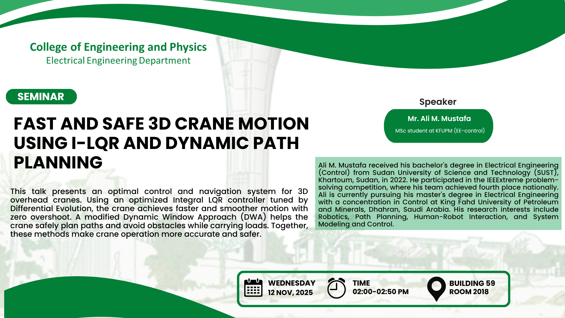 This talk presents an optimal control and navigation system for 3D overhead cranes. Using an optimized Integral LQR controller tuned by Differential Evolution, the crane achieves faster and smoother motion with zero overshoot. A modified Dynamic Window Approach (DWA) helps the crane safely plan paths and avoid obstacles while carrying loads. Together, these methods make crane operation more accurate and safer.