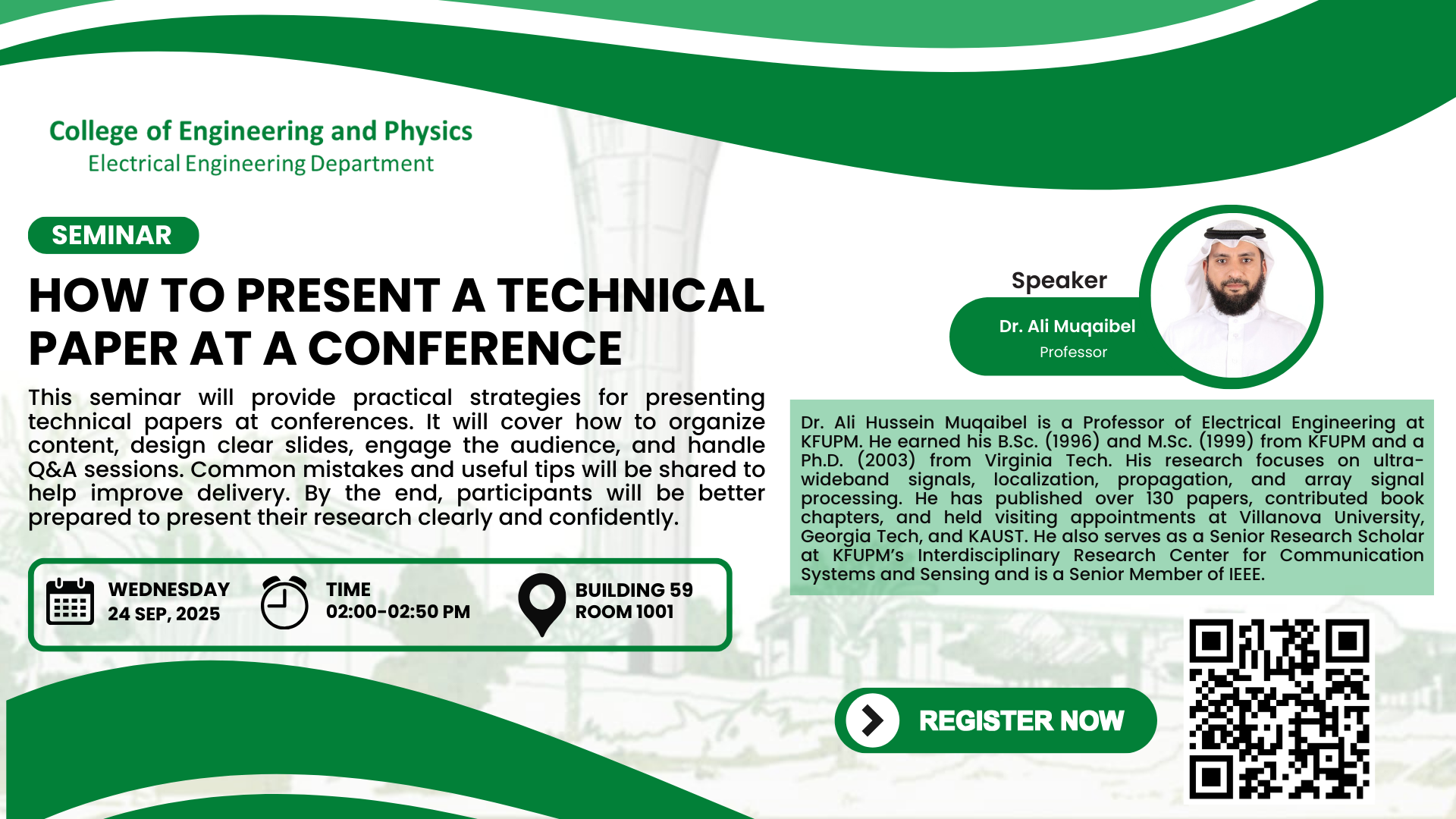 This seminar will provide practical strategies for presenting technical papers at conferences. It will cover how to organize content, design clear slides, engage the audience, and handle Q&A sessions. Common mistakes and useful tips will be shared to help improve delivery. By the end, participants will be better prepared to present their research clearly and confidently.