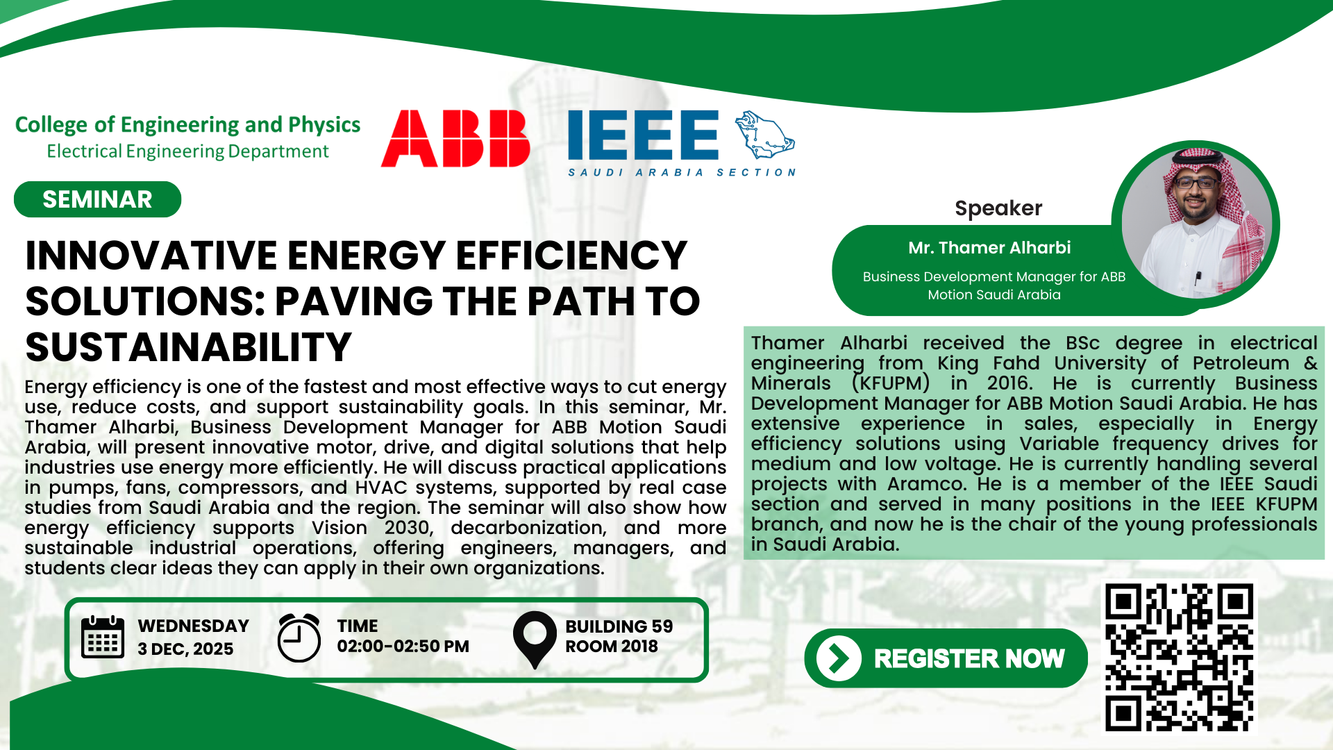 Energy efficiency is one of the fastest and most effective ways to cut energy use, reduce costs, and support sustainability goals. In this seminar, Mr. Thamer Alharbi, Business Development Manager for ABB Motion Saudi Arabia, will present innovative motor, drive, and digital solutions that help industries use energy more efficiently. He will discuss practical applications in pumps, fans, compressors, and HVAC systems, supported by real case studies from Saudi Arabia and the region. The seminar will also show how energy efficiency supports Vision 2030, decarbonization, and more sustainable industrial operations, offering engineers, managers, and students clear ideas they can apply in their own organizations.